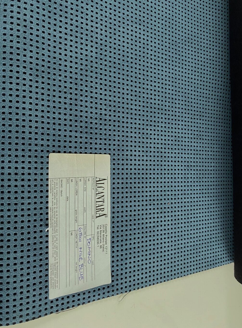 Alcantara Domino 6801 Blue Nile – 475 x 141 cm – zacht blauw met zwart, patroon