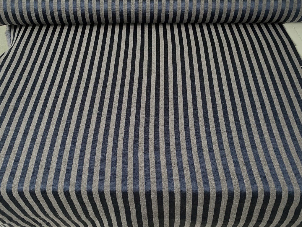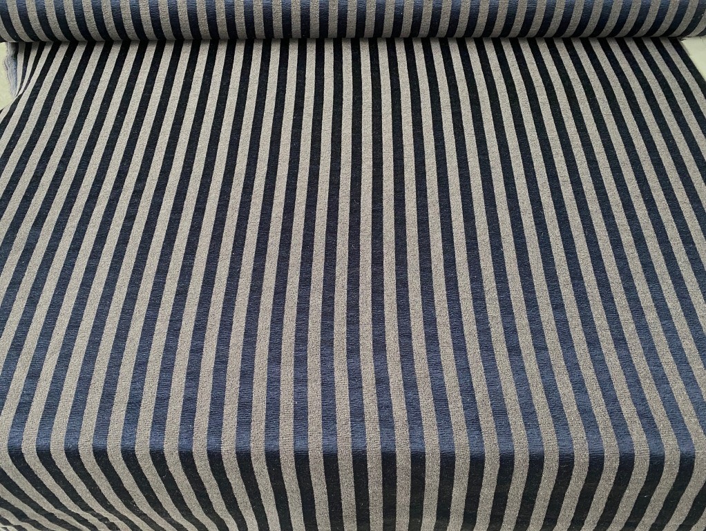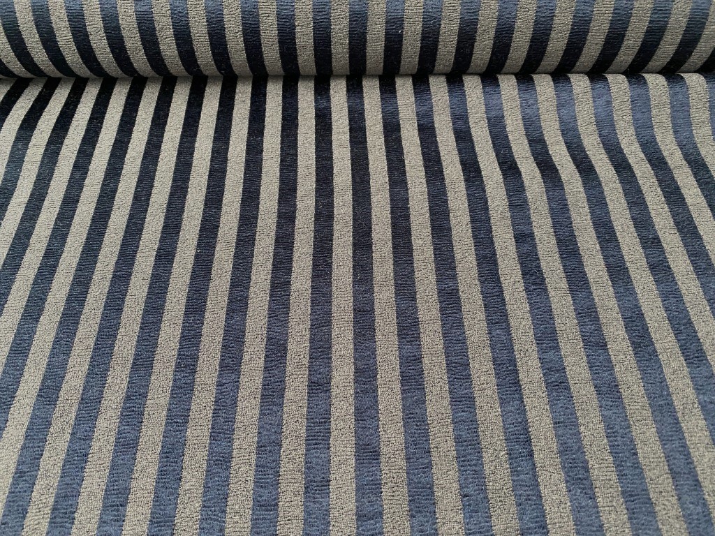 Meubelstof blauw (glanzend) met donker grijs (mat), verticaal streep patroon