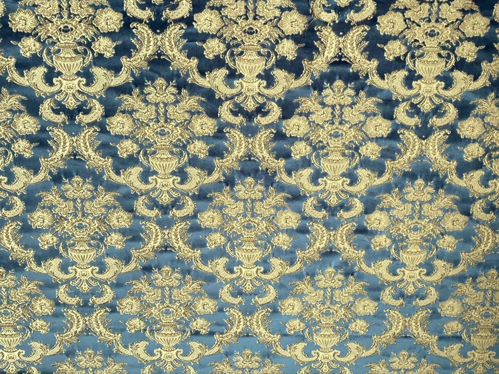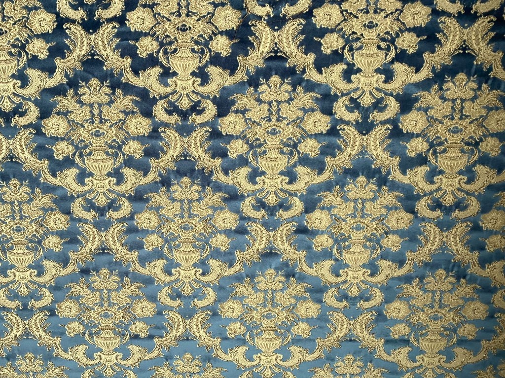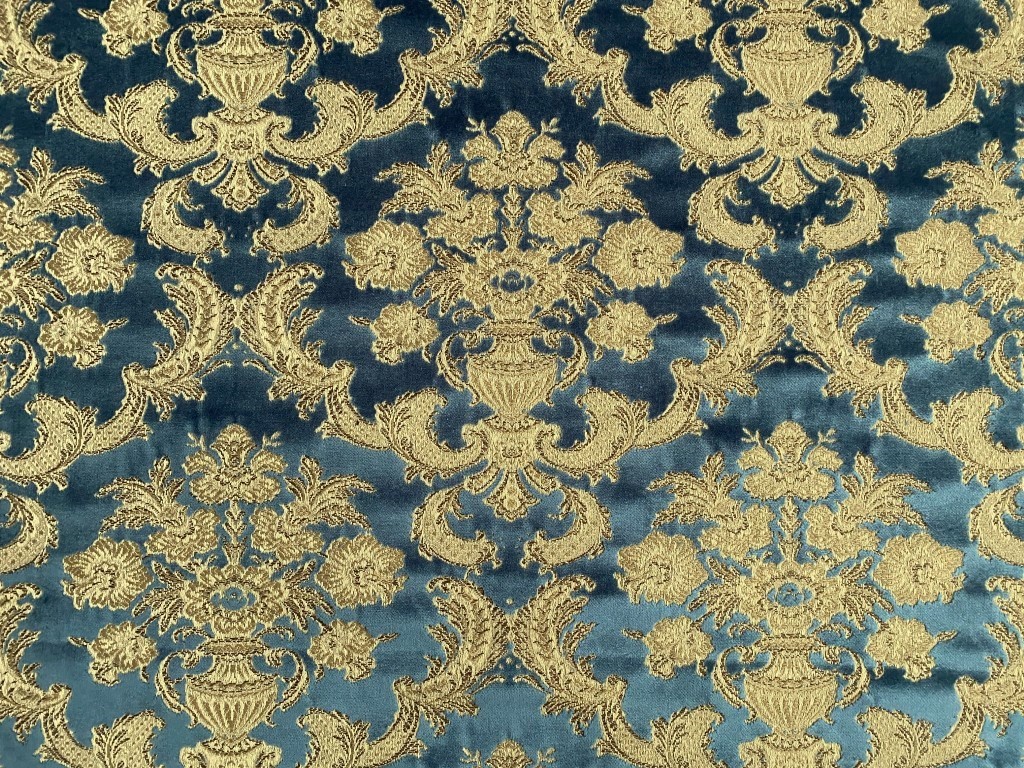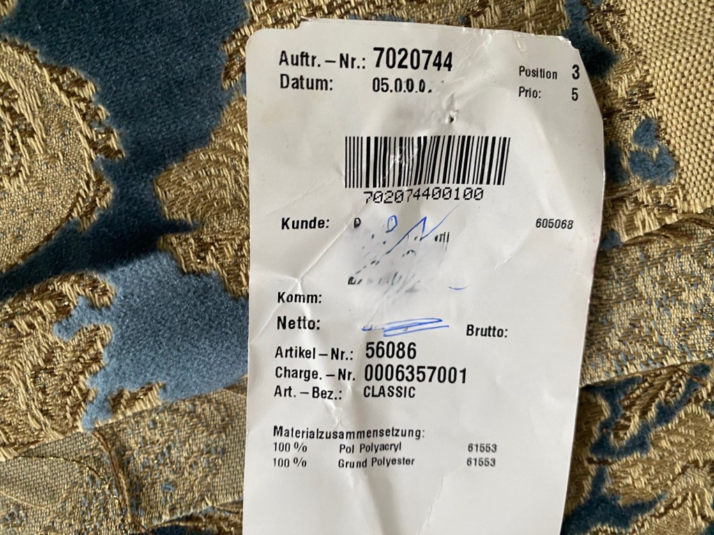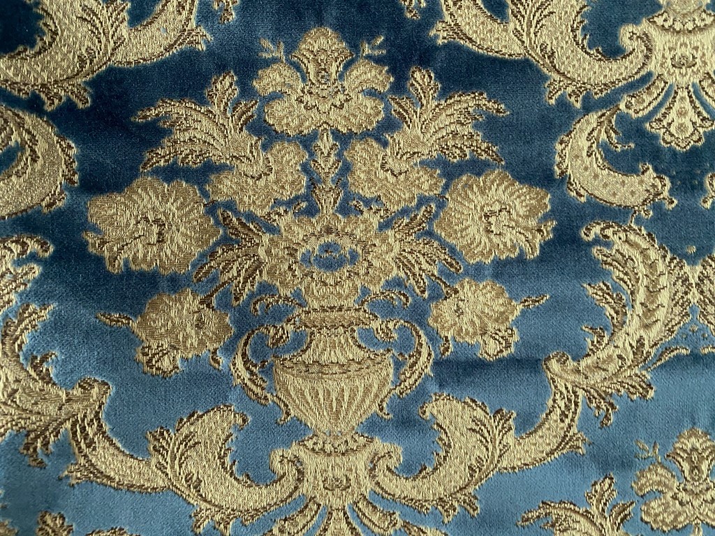 - Kleur: barok patroon in blauw velours, gouddraad en beige