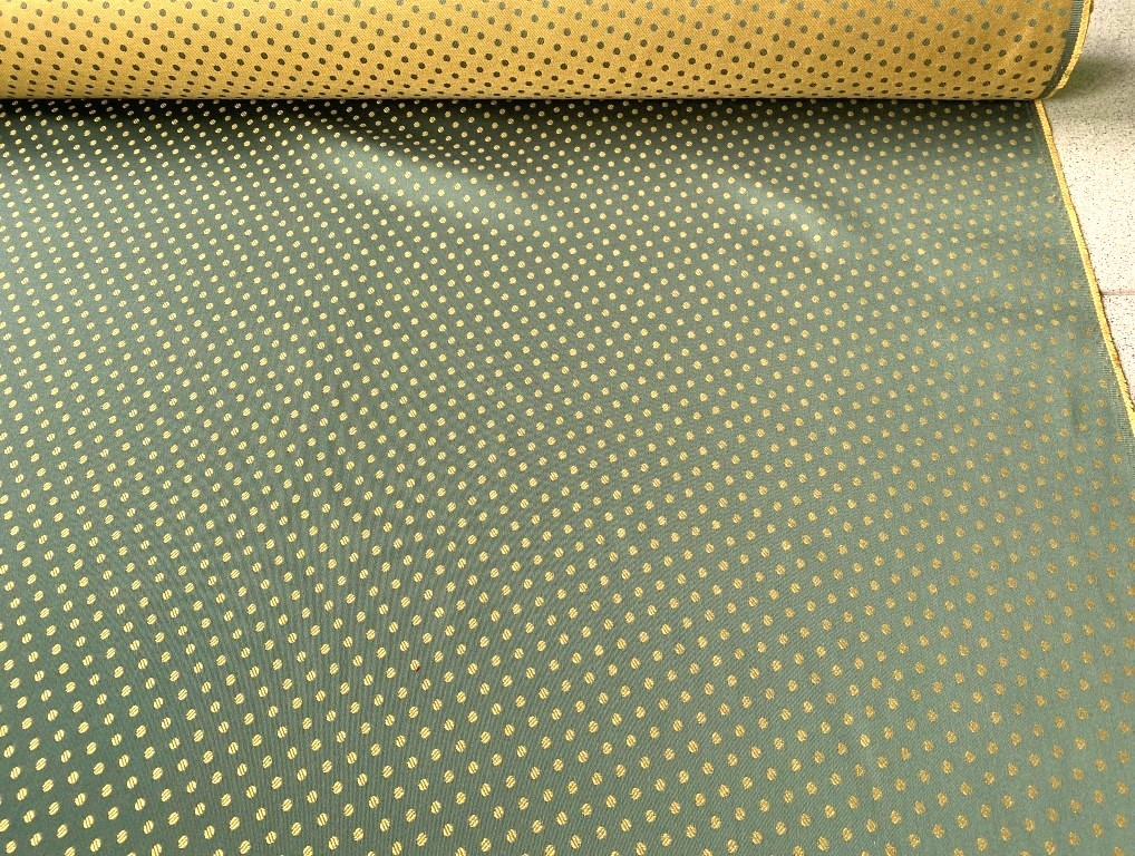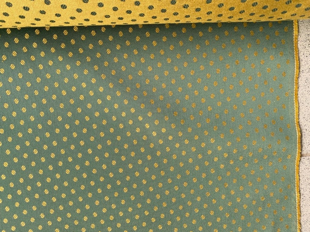 - Omschrijving: een bijzondere, iets glanzende, vintage meubelstof. Goudgele 'koffieboontjes' welke zijn ingeweven op een groene ondergrond. Geef uw vintage / retro / moderne design meubel een bijzondere uitstraling met deze aparte en zacht aanvoelende bekledingsstof.
